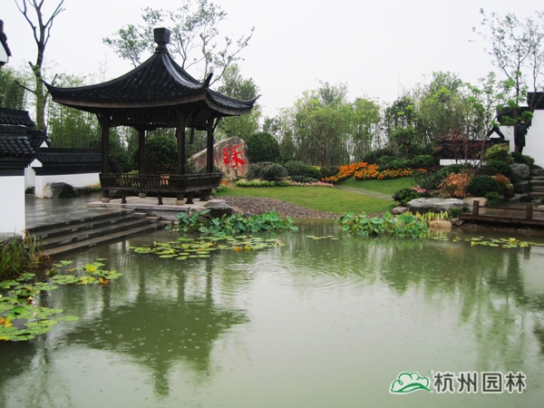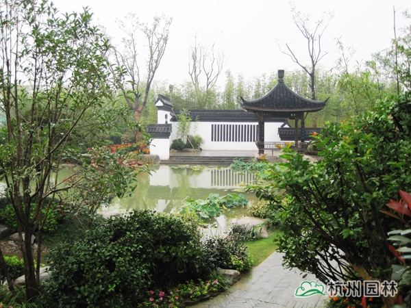 第二屆中國綠化博覽會之杭州園,又名“緣園”。以西湖美麗的傳說《白蛇傳》為設計脈絡,將故事提煉成斷橋相逢、同心定緣、平湖秋月、雷峰夕照四個精華部分,融入到工程綠化作品中,運用多桿叢生植物和木本花境為造景元素,平臺、小橋、埠頭、沙灘、景石,勾勒水鄉(xiāng)風韻;粉墻、黛瓦、圓門、方亭、水榭,追憶江南情懷,由此達到了景中有情、情中有景,用園林綠化的丹青妙筆描繪出一幅情景交融的江南風情畫卷。漫步緣園,仿佛回到千年前的西湖:風景如畫、才子佳人、江南煙雨、風光旖旎,斷橋之上,許仙與白娘子洋溢纏綿悱惻的浪漫愛情傳奇……