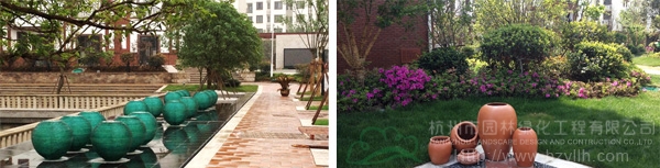 更值得一提的,還有隨處可見的草坪,隨著道路的延伸,草坪時(shí)而在不同的植物組團(tuán)四周鋪展,時(shí)而與一棵棵高大的香樟、無患子為鄰,間或在小廣場的四周漫生一片綠意。大面積的草坪應(yīng)用,使得小區(qū)就像坐落在一片綠色的地毯中,映著白墻紅瓦的建筑,更顯綠意濃濃。不經(jīng)意見,更見幾只高低不一的紅陶瓷罐隨意散落在草坪里,在陽光的照耀下,泛出溫潤的光澤,一段靜謐的時(shí)光,仿佛就這樣凝固了。