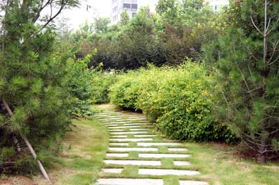而在道路十字路口的節(jié)點處,則主要是用10cm×10cm的小花崗巖鋪地,鋪出來的路面整潔、平坦,看似簡單,實則對施工技術(shù)要求相當高。草坪中的地面鋪裝,則采用花崗巖汀步,用錯縫鋪裝法,兩塊花崗巖之間用草皮鑲嵌,就像給每塊花崗巖鑲了一道綠邊,與旁邊的草坪和諧地融為一體。貫穿整個工程的游憩步道,全部采用“人字形”的鋪裝方法,中間用透水磚、兩邊以花崗巖鑲邊,透水磚價格不高,用以鑲邊的花崗巖是利用了鋪裝中剩余的邊料,雖然用料簡單,但通過對技術(shù)的嚴格要求,鋪出的路面卻整潔而不失韻味,是一種實用、環(huán)保、節(jié)約的做法。