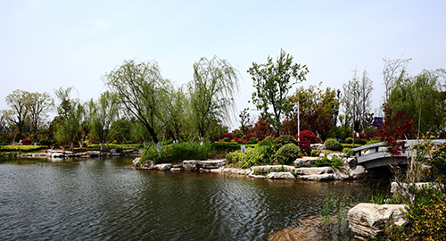 其中,人工湖面積7000平方米,小而精致,可謂是整個公園的“點睛之筆”。由親水平臺區(qū),源頭區(qū),中心湖面區(qū),鄰水生態(tài)區(qū),橋梁區(qū)構(gòu)成。湖面區(qū)域貫穿整個工程,沒有自然條件的襯托,完全由人工園林造景手法完成,在鄰水景觀帶種植睡蓮、荷花、再力花、千屈菜、鳶尾、蘆葦?shù)人参铮瑺I造生態(tài)岸線,同時選擇其他親水植物,如美人蕉、碧桃、楊柳、水杉作為過渡和背景,虛實結(jié)合,營造出多方位的景觀效果。湖面雖小,但結(jié)構(gòu)完整,假山疊水,拱橋,原石臨水橋,湖邊卵石生態(tài)群落一應(yīng)俱全。其中,景石主要使用了安徽的靈璧景石,約7000噸,堆疊出水源、暗橋、親水沿岸等景觀。