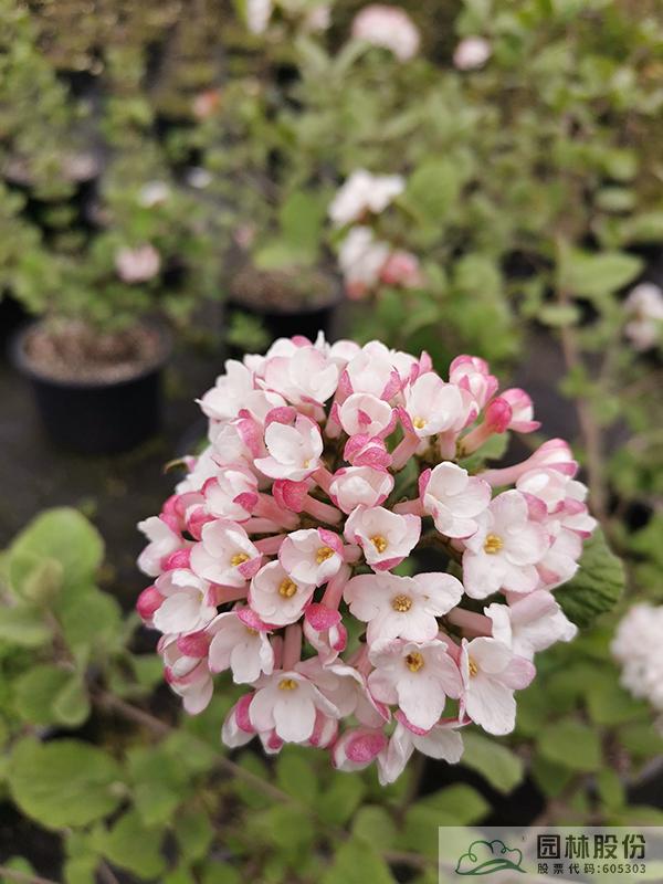 忍冬科莢蒾屬,半常綠或常綠灌木,株高2-3 m,為紅蕾莢蒾和煙管莢蒾的雜交種。葉色深綠,秋季轉(zhuǎn)紅,顏色程度因所處地區(qū)而異。該種繼承了紅蕾莢蒾粉花的優(yōu)良基因,花序未開(kāi)放時(shí)呈現(xiàn)靚麗的粉色,開(kāi)放后白色,且具有較濃郁的花香?;◤揭话?.5-10 cm,花期3-4月。植株具有良好的頂端優(yōu)勢(shì),枝條年生長(zhǎng)量大,但分枝能力稍弱。幾乎無(wú)病蟲害。適應(yīng)性強(qiáng),生長(zhǎng)速度快,耐干旱且耐寒,適合自然風(fēng)格的工程應(yīng)用或庭院觀賞。