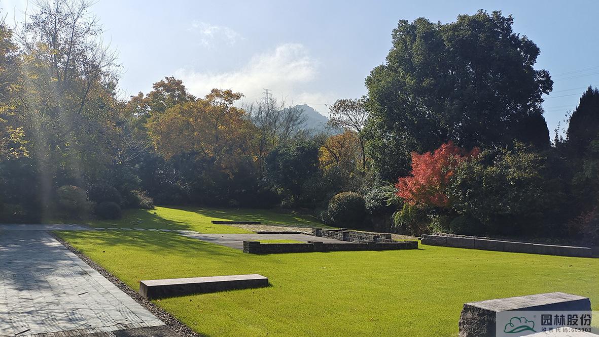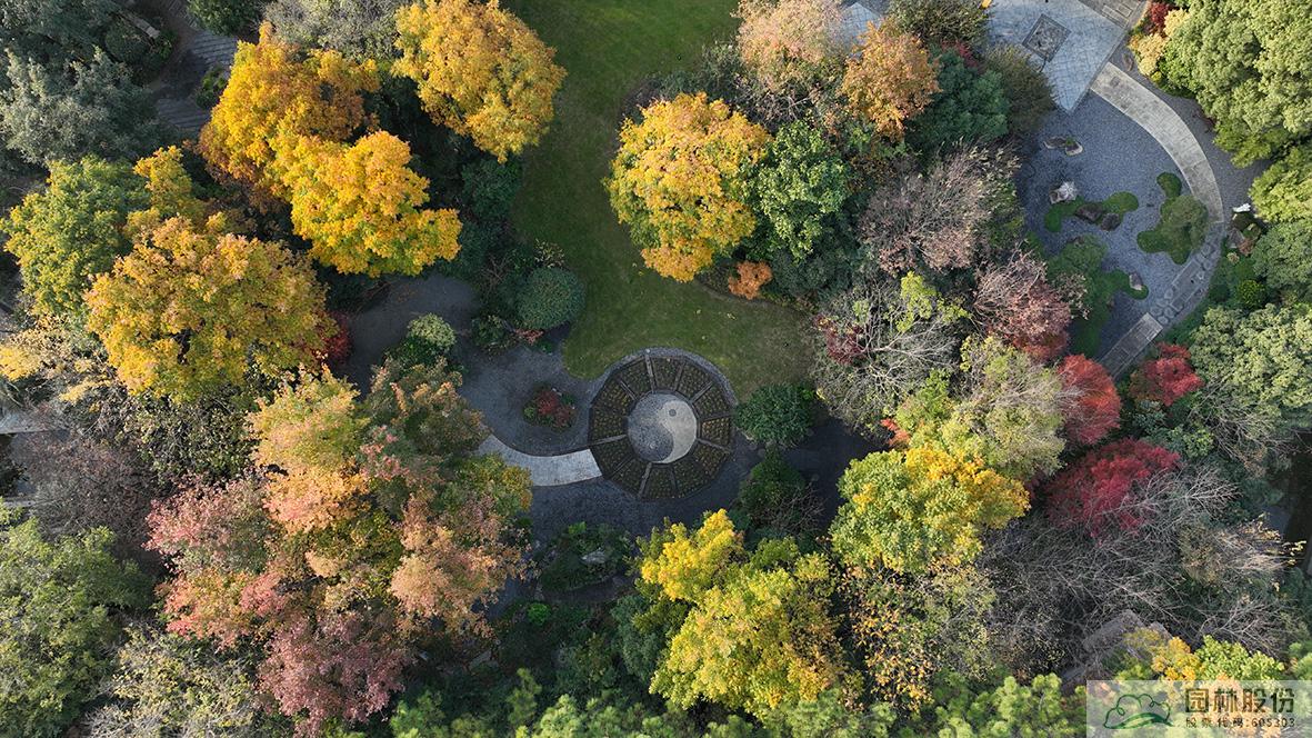 俯視畫境園南園,楓香林在陽光中的色彩愈加斑駁,無患子綠色尚未全部褪去,金黃色樹冠愈加油亮,盡顯英式風(fēng)景林的自然、灑脫。
