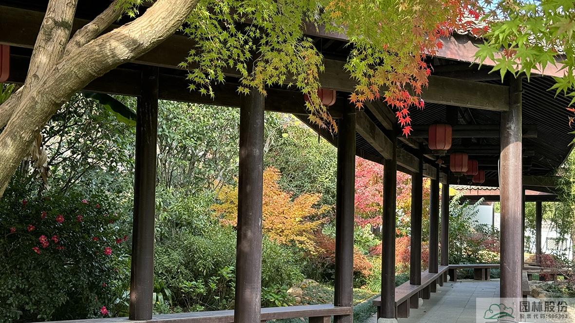 中式庭院中,紅楓將古色古香的木結(jié)構(gòu)長廊襯托的更具江南古典園林氣息