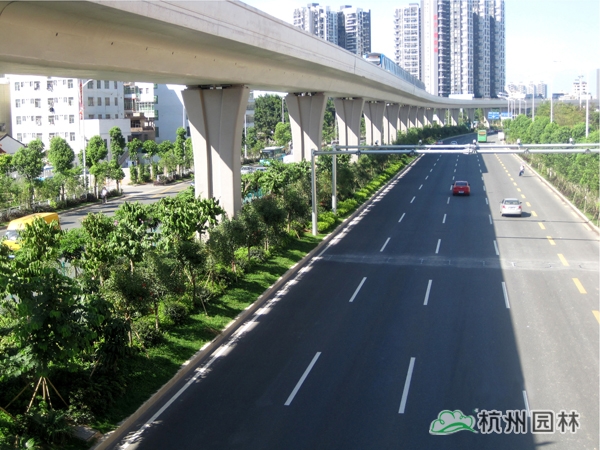 該工程位于國(guó)道205深圳段龍崗區(qū)地鐵三號(hào)線愛聯(lián)地鐵站至坪地與惠州市交界處,施工內(nèi)容包括綠化種植、綠化噴灌與管道安裝等。植物配置遵循適地適樹的原則,并充分考慮與城市風(fēng)格的吻合,兼顧多樣性和季節(jié)性,通過多層次、多品種的搭配,營(yíng)造出處處有綠葉、無處不飛花,一路風(fēng)景變化萬千的城市景觀帶。