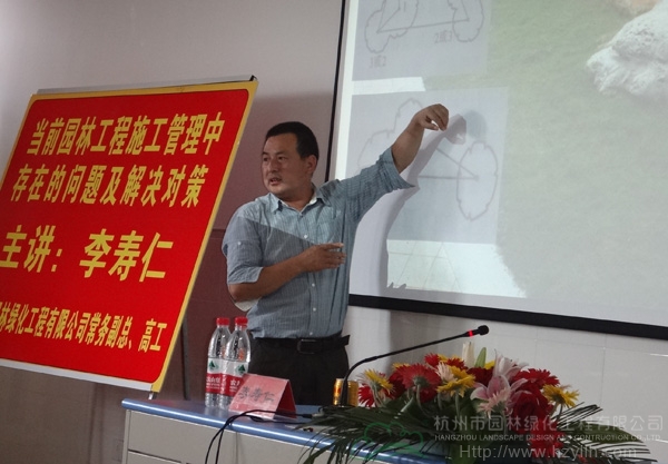7月4日,應(yīng)寧波城市職業(yè)技術(shù)學(xué)院邀請(qǐng),杭州市園林綠化工程有限公司常務(wù)副總李壽仁在該校舉辦的“第三期園林企業(yè)經(jīng)營(yíng)管理人才高級(jí)研修班”上作“當(dāng)前園林工程施工管理中存在的問(wèn)題與解決對(duì)策”專(zhuān)題講座,到場(chǎng)聽(tīng)課的有來(lái)自寧波地區(qū)的園林企業(yè)高管、項(xiàng)目經(jīng)理以及在校師生。