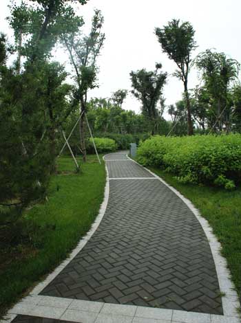 而在道路十字路口的節(jié)點處,則主要是用10cm×10cm的小花崗巖鋪地,鋪出來的路面整潔、平坦,看似簡單,實則對施工技術(shù)要求相當高。草坪中的地面鋪裝,則采用花崗巖汀步,用錯縫鋪裝法,兩塊花崗巖之間用草皮鑲嵌,就像給每塊花崗巖鑲了一道綠邊,與旁邊的草坪和諧地融為一體。貫穿整個工程的游憩步道,全部采用“人字形”的鋪裝方法,中間用透水磚、兩邊以花崗巖鑲邊,透水磚價格不高,用以鑲邊的花崗巖是利用了鋪裝中剩余的邊料,雖然用料簡單,但通過對技術(shù)的嚴格要求,鋪出的路面卻整潔而不失韻味,是一種實用、環(huán)保、節(jié)約的做法。