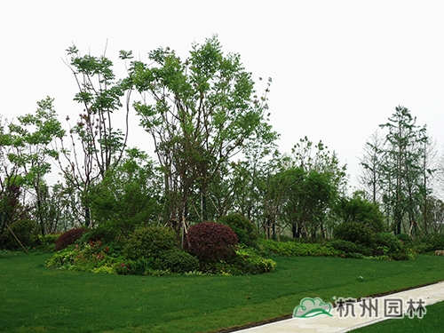 在1號(hào)樓和2號(hào)樓之間,植物配置講究的是層次的錯(cuò)落有致、季相色彩的豐富多變、天際線的分明起伏、林緣線和草坪線的視覺流暢,遵循大自然本身的多樣性、群落性、生態(tài)性的原則,營(yíng)造出對(duì)比強(qiáng)烈、富有節(jié)奏和韻律感的園林景觀。其中,高層主要用榔榆、香樟、櫸樹、落羽杉,中層用桂花、紅楓、雞爪槭、白玉蘭,低層用紅梅、石楠、紅花檵木等,在有限的空間里,營(yíng)造出變化多端的園林景致,特別是大規(guī)格造型植物的應(yīng)用,更是起到了畫龍點(diǎn)晴的作用。
