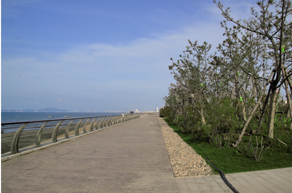 煙臺屬暖溫帶季風(fēng)氣候,但是瀕海地又受到海洋性氣候的影響,經(jīng)常受海潮海風(fēng)侵襲和土壤鹽漬化、干旱化威脅,導(dǎo)致適宜生存的植物種類少、綠化難度大。該項(xiàng)目緊臨海邊,因此,如何正確選擇植物品種,在提高植物成活率的同時(shí)又保證景觀效果的豐富,是其面臨的一大難題。