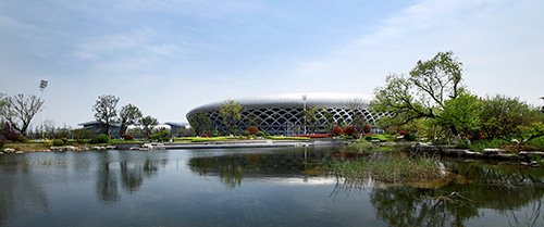 據(jù)夏修智介紹,奧體公園是工程的主要景觀節(jié)點,位于奧體中心西北側(cè),面積約5萬平方米,是一座集娛樂、運動為一體的特色濱水運動公園,也是整個奧體中心的“綠肺”。一條蜿蜒的河流將公園劃分為東部運動區(qū)和西部休閑公園區(qū)。運動區(qū)緊挨訓(xùn)練中心,東側(cè)便是足球場、籃球場和排球場,運動后就能感受到融入大自然的清新;休閑公園區(qū)包括入口廣場、樹陣廣場、以及河水匯聚而成的小人工湖,湖邊蘆葦迎風(fēng)擺動,湖水清澈見底,鵝卵石鋪就的湖底清晰可見。整個奧體公園以中國古典園林為主、回歸自然的組團式造景手法,強調(diào)休閑、幽靜、生態(tài)自然。從西入口廣場的草坡,逐漸過渡到觀賞性強的觀花、觀葉園林樹種,配合灌木、草木、地被形成人為景觀,從西到東植物次第減少,層次不斷變化,形成了從自然生態(tài)狀綠化到人工幾何狀綠化的逐漸過渡,讓自然的活力與體育精神融為一體。