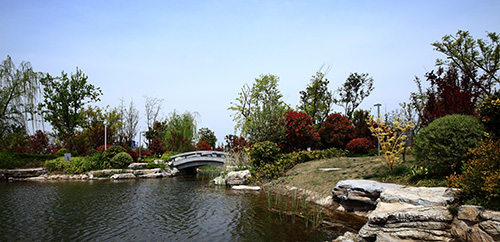 其中,人工湖面積7000平方米,小而精致,可謂是整個公園的“點睛之筆”。由親水平臺區(qū),源頭區(qū),中心湖面區(qū),鄰水生態(tài)區(qū),橋梁區(qū)構(gòu)成。湖面區(qū)域貫穿整個工程,沒有自然條件的襯托,完全由人工園林造景手法完成,在鄰水景觀帶種植睡蓮、荷花、再力花、千屈菜、鳶尾、蘆葦?shù)人参铮瑺I造生態(tài)岸線,同時選擇其他親水植物,如美人蕉、碧桃、楊柳、水杉作為過渡和背景,虛實結(jié)合,營造出多方位的景觀效果。湖面雖小,但結(jié)構(gòu)完整,假山疊水,拱橋,原石臨水橋,湖邊卵石生態(tài)群落一應(yīng)俱全。其中,景石主要使用了安徽的靈璧景石,約7000噸,堆疊出水源、暗橋、親水沿岸等景觀。