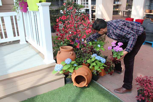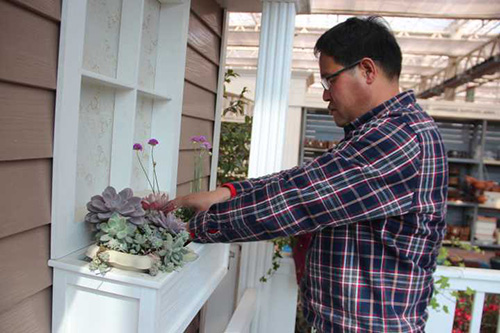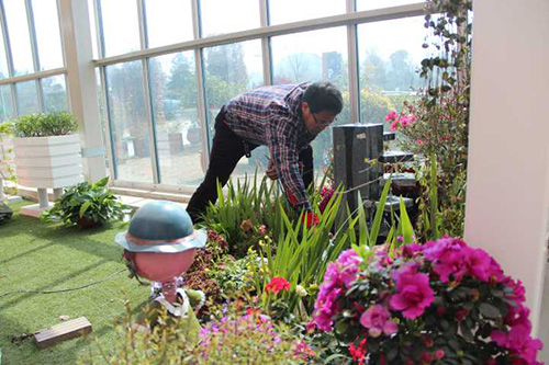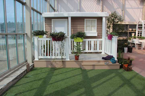 ▲我們選擇園藝中心室內(nèi)一處小木屋的陽臺,作為造景點。園藝師現(xiàn)場查勘后,初步確定花境布置點的面積和風(fēng)格。