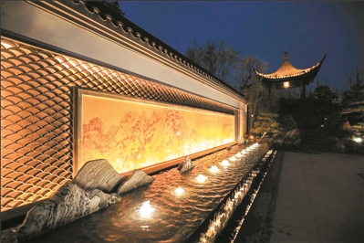 園區(qū)入口廣場,迎面是一組水墨墻照壁,圖案原型是“富春山居圖”的一部分。