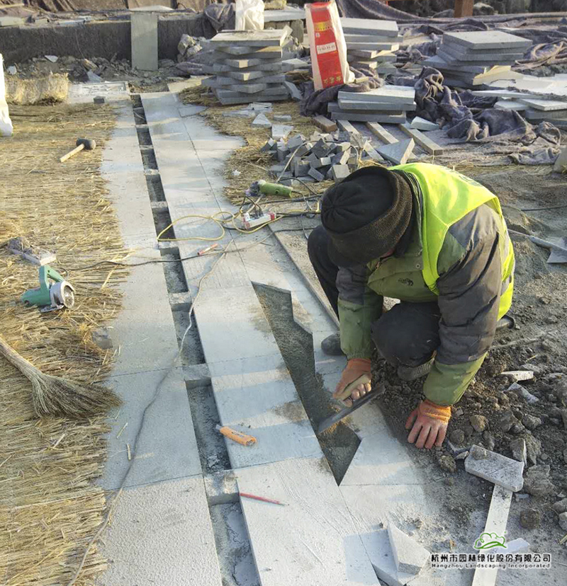 “白天溫度在零度以上時(shí),我們趁著太陽(yáng)出來(lái)、溫度比較高的時(shí)候施工;等太陽(yáng)快下山時(shí),溫度下降很快,這時(shí),我們就停止施工,用毛氈、草墊等將做好的鋪裝蓋起來(lái),再搭上保濕棚保溫。因?yàn)槿绻E胧┳霾坏轿?,白天做好的鋪裝,晚上就會(huì)凍壞,導(dǎo)致白天的工作功虧一簣。一些種好的精品樹(shù)木,如造型黑松,我們就用很厚的棉被包裹起來(lái),以防凍傷?!被貞浧甬?dāng)初的施工過(guò)程,吳小成依然覺(jué)得這是施工中一段時(shí)常難熬的時(shí)期,“零下15℃的時(shí)候,我們還在施工,此時(shí)水已經(jīng)全部結(jié)冰,但施工又離不開(kāi)水,怎么辦呢?我們買(mǎi)了一個(gè)加熱器,把冰放到桶里,再把桶加溫化水,以此來(lái)滿(mǎn)足施工中的用水需求。”