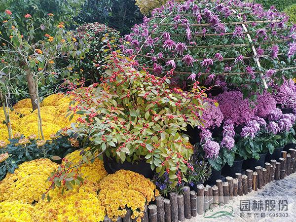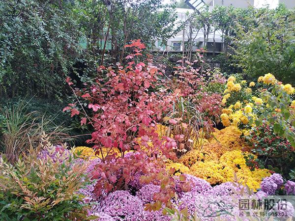 一種是未落葉的北美冬青,紅果掩映在綠色葉片中,活潑可愛。球菊和蟹爪菊都是球狀,自然舒展形態(tài)的北美冬青打破了該處單調(diào)的格局,同時(shí)也在高度上進(jìn)行了過渡。