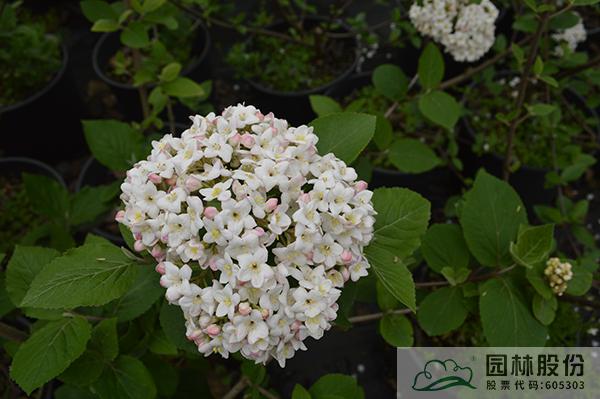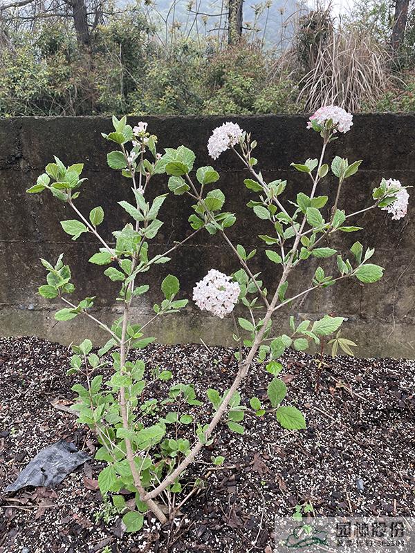 忍冬科莢蒾屬,落葉灌木,株高3-4.5 m,為瓊花和紅蕾莢蒾的雜交種。葉片較厚,較大,到秋季變成酒紅、橙紅或紫色色調(diào)。聚傘花序花蕾粉紅色,開(kāi)放后白色,聚集似小雪球,具芳香,花徑8-14cm,花期3-4月。喜光,半陰環(huán)境也生長(zhǎng)良好,生長(zhǎng)速度中等;擇土不嚴(yán),微酸性、中性至微堿性土壤均可生長(zhǎng),尤喜濕潤(rùn)、排水良好的富含有機(jī)質(zhì)土壤;抗寒性強(qiáng);耐修剪,適合自然風(fēng)格的工程應(yīng)用或庭院觀賞。