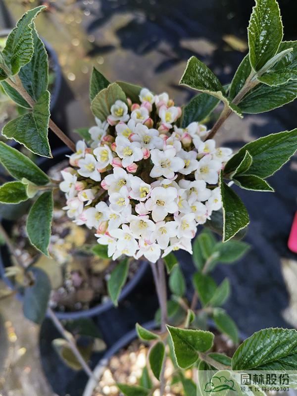 忍冬科莢蒾屬,半常綠或常綠灌木,株高2-3 m,為紅蕾莢蒾和煙管莢蒾的雜交種。葉色深綠,秋季轉(zhuǎn)紅,顏色程度因所處地區(qū)而異。該種繼承了紅蕾莢蒾粉花的優(yōu)良基因,花序未開(kāi)放時(shí)呈現(xiàn)靚麗的粉色,開(kāi)放后白色,且具有較濃郁的花香?;◤揭话?.5-10 cm,花期3-4月。植株具有良好的頂端優(yōu)勢(shì),枝條年生長(zhǎng)量大,但分枝能力稍弱。幾乎無(wú)病蟲害。適應(yīng)性強(qiáng),生長(zhǎng)速度快,耐干旱且耐寒,適合自然風(fēng)格的工程應(yīng)用或庭院觀賞。