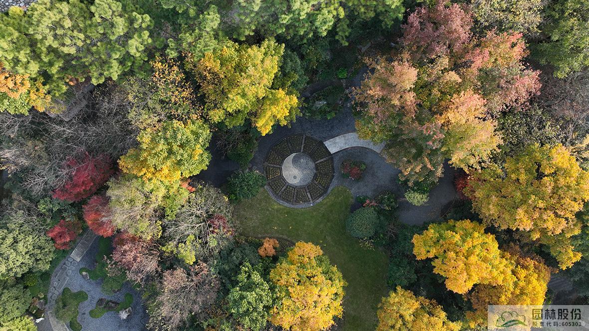 俯視畫境園南園,楓香林在陽光中的色彩愈加斑駁,無患子綠色尚未全部褪去,金黃色樹冠愈加油亮,盡顯英式風(fēng)景林的自然、灑脫。