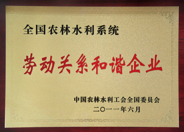 公司榮獲“全國(guó)農(nóng)林水利系統(tǒng)勞動(dòng)關(guān)系和諧企業(yè)”稱號(hào)
